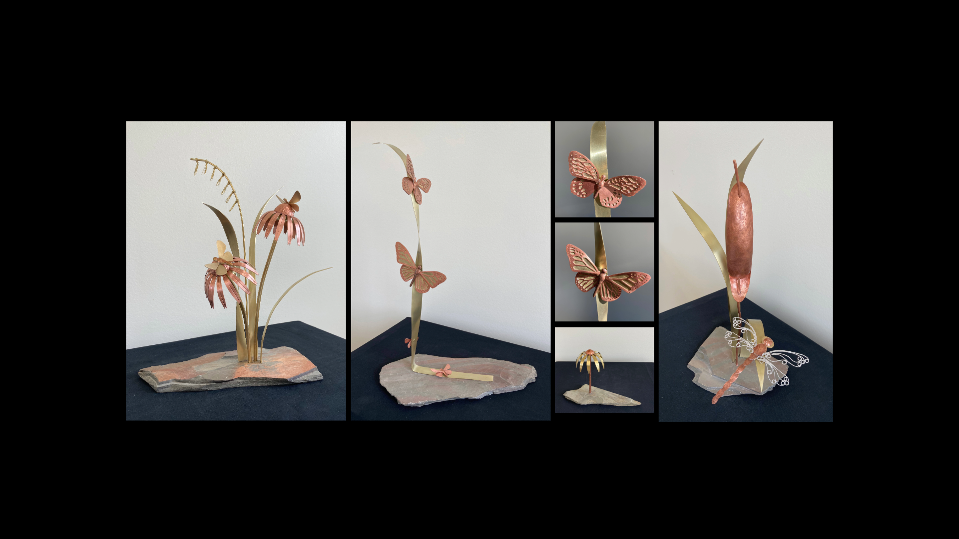 The sculpture will feature simplified forms of prairie and marsh plants and the insects they host. Bronze, copper, and brass will introduce multiple colors to each finished piece. Flat sheets of the base metals will be shaped into 3D forms using traditional hand tools, joined using jewelry soldering tools and techniques, and detailed using traditional metal chasing and repoussé tools and techniques.